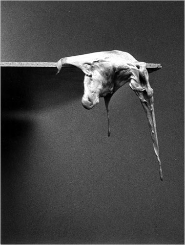 Her subversive interest in the democratic potential of art-making and ownership developed some years earlier, in sculptures designed to be mass-produced for the home. Lampe-Bouche(Lamp-Mouth, 1966) and Ventre-Coussin (Belly-Cushion, 1968) turn polyester resin casts of red-painted lips and multicoloured bellies into Pop-ish home furnishings. Offering something like the comfort of a kiss or a hug, they have a sensual allure that evolved heartbreakingly into the ‘Cendrier de Célibataire’ (Widower’s Ash-Tray) series made a year before her death in 1972 – including a polyester cup cast from two breasts, and photographs of cigarettes pressed into sticks of butter.