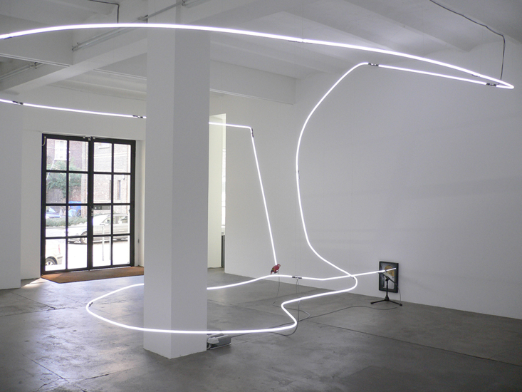 When Roccasalva showed Jockey Full of Bourbon in 2006, and a year later at Manifesta 7, the hole in the drawing had been blocked up, and, instead, a tube of white neon snaked out from it into the gallery, sweeping twice around a column before returning to the ground near the drawing. On the end perched the little owl. Only the most observant viewer would have noticed that the trajectory of the neon precisely followed the movement of the viewpoint around the church in his animation La Giocondità (2002). It was, in effect, a journey of optical enquiry played in reverse, the drawing throwing its gaze out into the room.