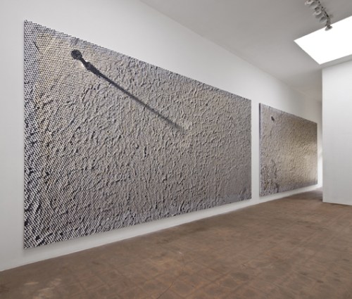 What is astonishing about them, however, is their scale: each canvas measures almost three-and-a-half by six metres. Hanging side by side, they occupied most of the gallery’s longest wall. The section of studio wall that they represent, however, lit from the side so as to accentuate its texture, must only be a few centimetres wide, and the half-tone image is blown up so that each dot is the size of a thumbnail. To help us gauge the scale of the magnification, Hylden has included in one photograph a screw, half sticking out of the wall and casting a long shadow diagonally across the canvas. In the second picture, it has been removed. It is, in a sense, a great big picture of nothing.