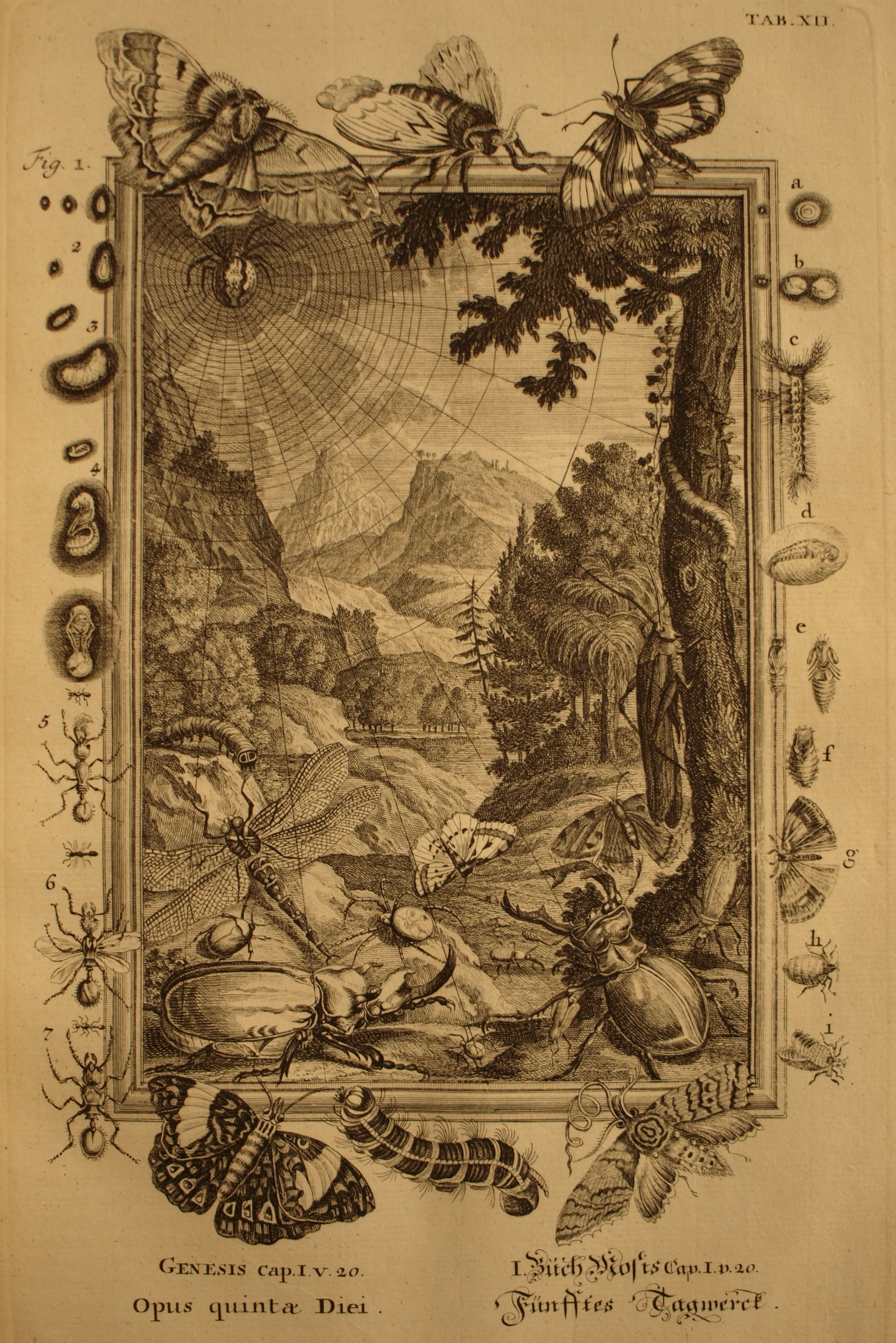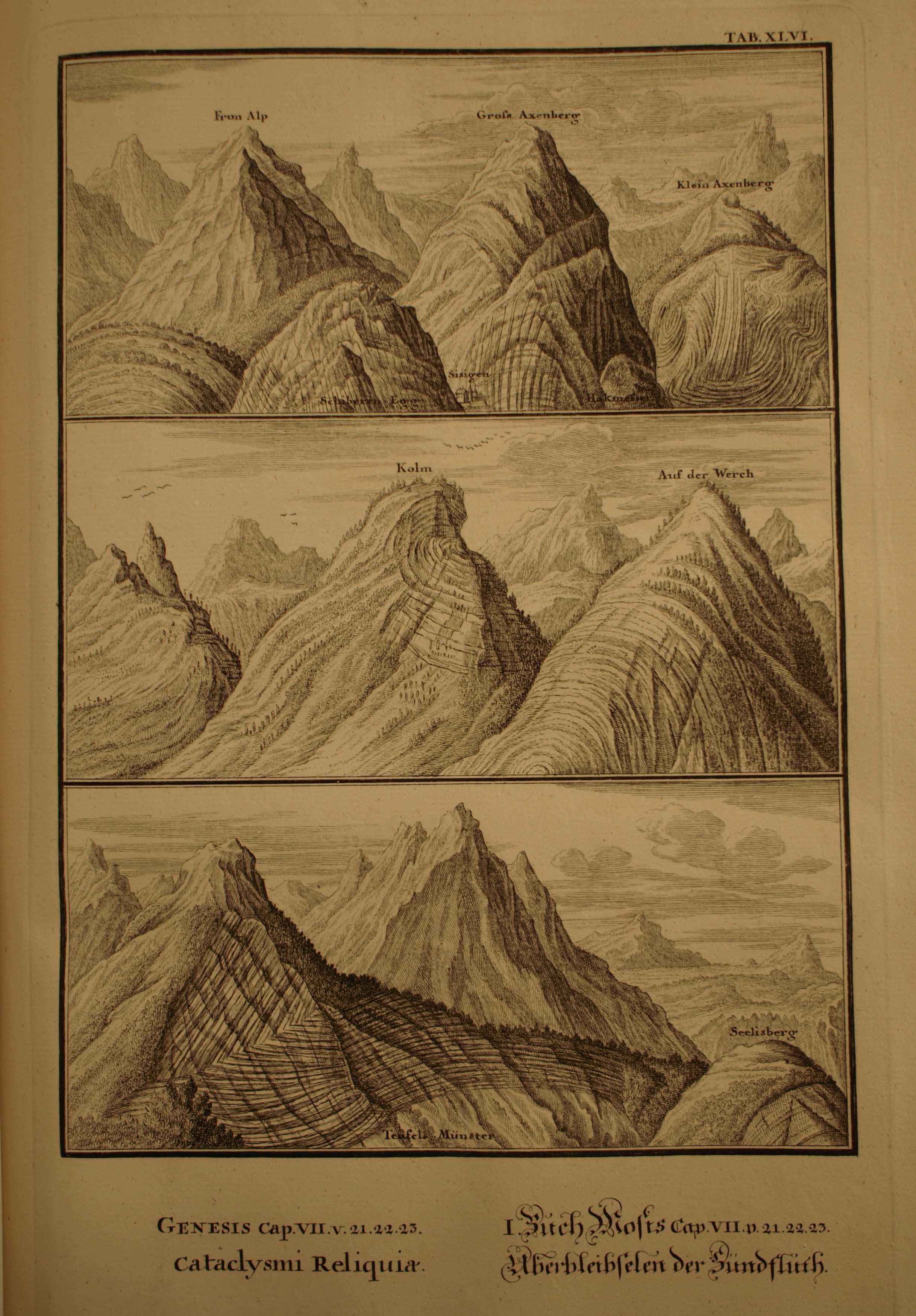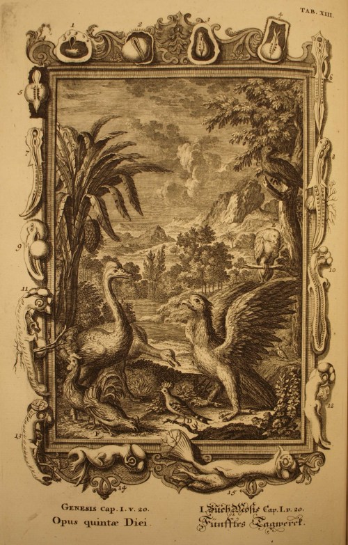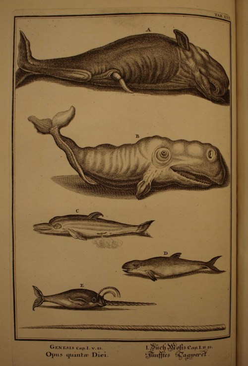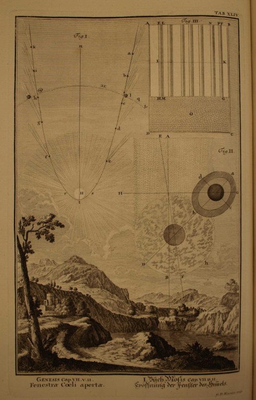 Last week, I finally tracked down the source: an eight volume work by the Swiss natural scientist and gentleman scholar Johann Jakob Scheuzcher (1672-1733) called Physica Sacra, published in 1732. I made an appointment at the library and was allowed to photograph the engravings in the huge, leather-bound tome. I’m so enthralled by the strangeness of these images that I want to share some of them here.