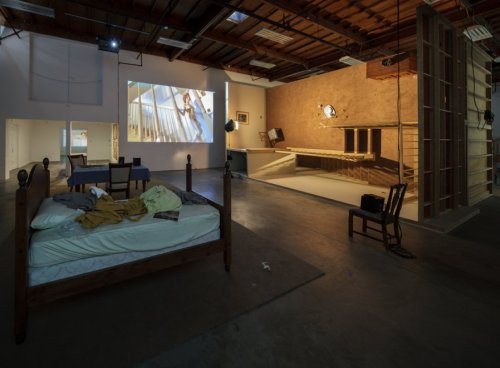 The doubling begins immediately. An exhibition across town, organized by MOCA and James Franco, called “Rebel,” themed (incredibly) around Franco’s resemblance to James Dean, finds its evil twin in “Rebel Dabble Babble.” It began with Franco inviting Paul McCarthy to collaborate on a project based on Rebel Without a Cause (1955), and ended up with McCarthy and his son Damon creating house-sized sets in their studio, staging auditions, filming, and performing in scenes with actors (who played hybrids of cinematic characters and the actors who originally played them) and, ultimately, shooting scenes for a pornographic version of Rebel Without a Cause featuring an actor named James Deen, who, like Franco, is a dead ringer for its original tragic star. A watered-down version of the project remains in MOCA’s exhibition, but at The Box it unfurls into full exhaustive glory.