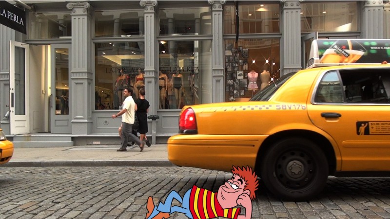 What we think of the artist is a pivotal question in Raspberry Poser. An uncharitable critic might interpret the nearly fourteen-minute film collage as a modish exercise in cultural referencing; its disparate sources (bourgeois interior design magazines, shop windows, history-book prints of Caravaggio and Breughel, tabloid newspaper cartoons) could seem to come proffered by the artist at arm’s length, with an ironic smirk like that of the cocksure punk who wanders through Paris in one section of the film.