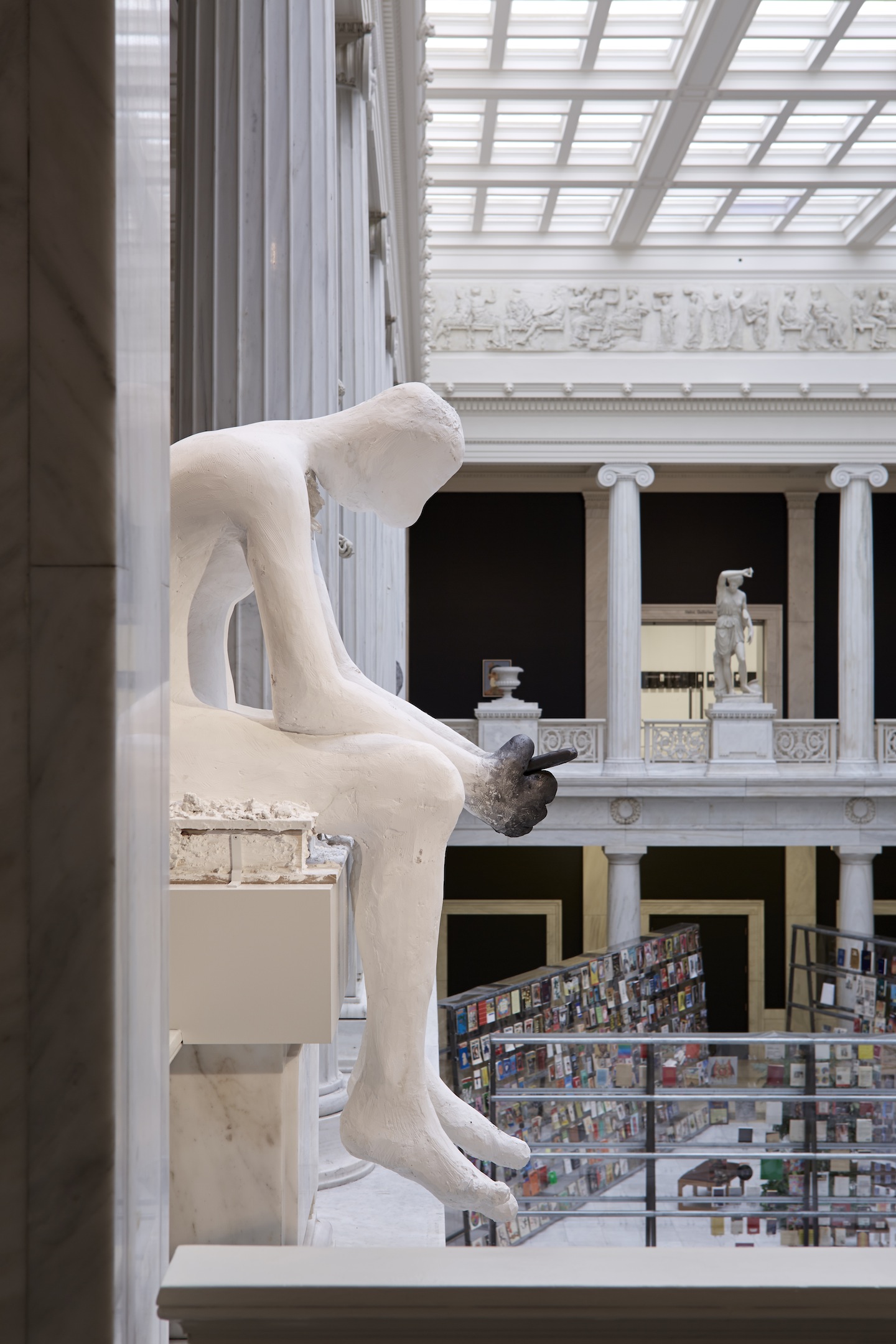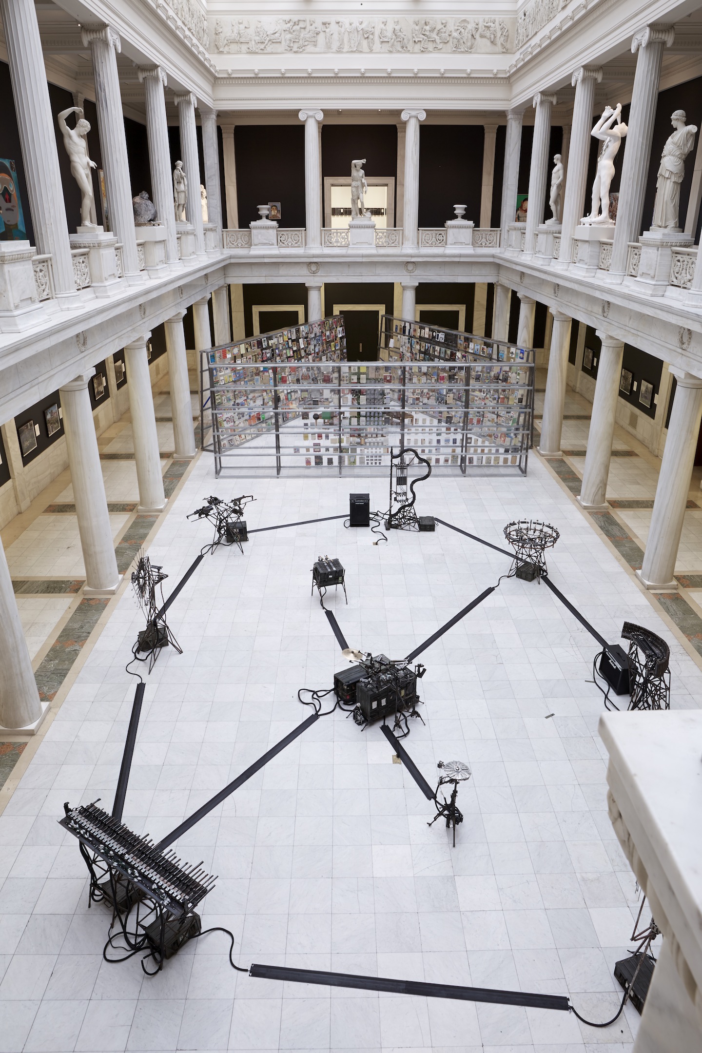 Nearby, Nicole Eisenman’s paintings and plaster sculptures, by turns forlorn, riotous, and sexy, occupy the second-floor balcony that edges the classically furbished Hall of Sculpture. A doughy figure thumbing his smartphone dangles his legs from a pedestal and waits for sculptures by the Mexican artist Pedro Reyes on the floor below to spring to life, which, intermittently, they do. Disarm (Mechanized) (2012–13) is a wired network of musical instruments made from scrap metal that automatically hum, drone, clatter, and ping; on closer inspection, they turn out to be welded entirely from bits of decommissioned handguns and assault rifles. If Reyes’s concept sounds a touch heavy-handed (it is) then the sounds that echo around the museum compensate with their pervasive atmospherics.
