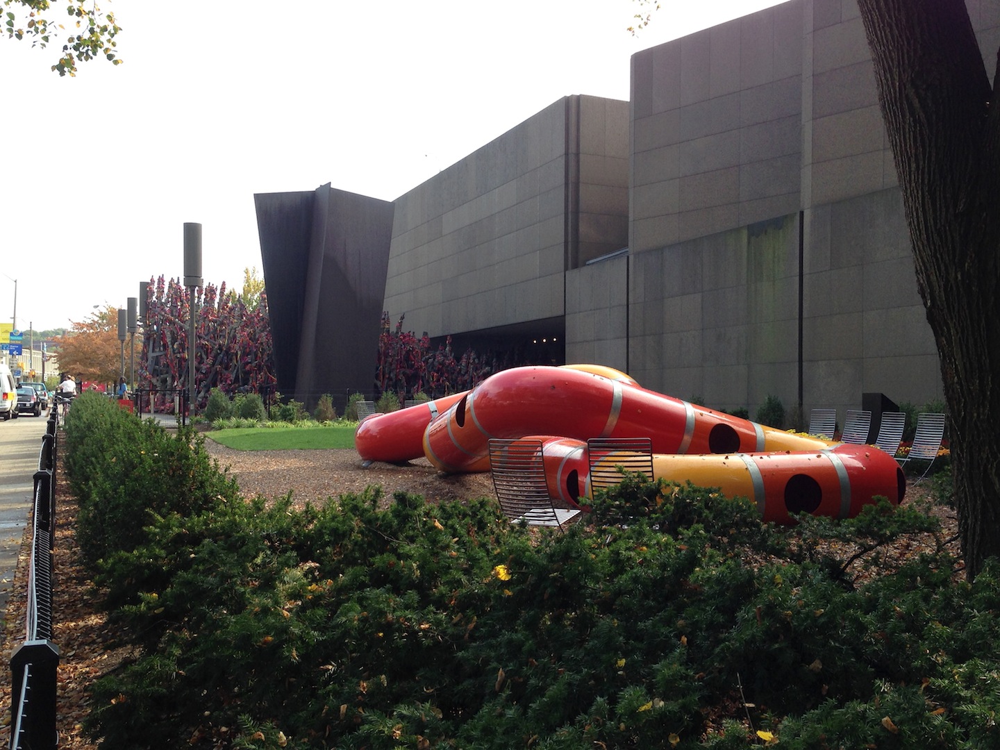 In the hands of the curators, the museum becomes a thoroughly porous entity, and artworks leak in and out on all sides. In front of the building, passersby are arrested by British sculptor Phyllida Barlow’s TIP (2013), a forest of wooden beams tied with strips of bright fabric that barrels out of the museum’s entrance onto the sidewalk. Even at the exhibition’s opening it appeared well on its way to disintegration, its red and purple streamers heavy from recent rain. Barlow’s anti-form gesture seemed designed to give the finger to Richard Serra’s permanent steel sculpture Carnegie (1985) that towers beside it.