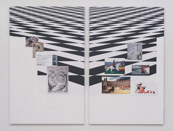 One such quasi-painting—a diptych, titled Bobby Jesus’s Alma Mater, passage from a movement therein: la puta madre (2014)—presents a sequence of images that runs from Gustave Courbet’s L’Origine du Monde [The Origin of the World] (1866) to a photograph of two gang-members (a Crip and a Blood) fighting on a Los Angeles street. Between them are images that include an etching by Austrian artist Anton Lehmden (b. 1929) of the ruined and distinctly vaginal Colosseum (1959–61), a photograph of a Roman centurion mascot at the USC Trojans football stadium (known as the Coliseum), and paintings of Christians being slaughtered for entertainment in the Roman Coliseum. Gangsters, she seems to imply, kill each other today for our entertainment; motherhood––a metaphor for the pedagogical system, and its failures (Alma mater, of course, literally means “nurturing mother” while puta madreis usually translated as “mother fucker”)––is the arena in which this tragedy unfolds.