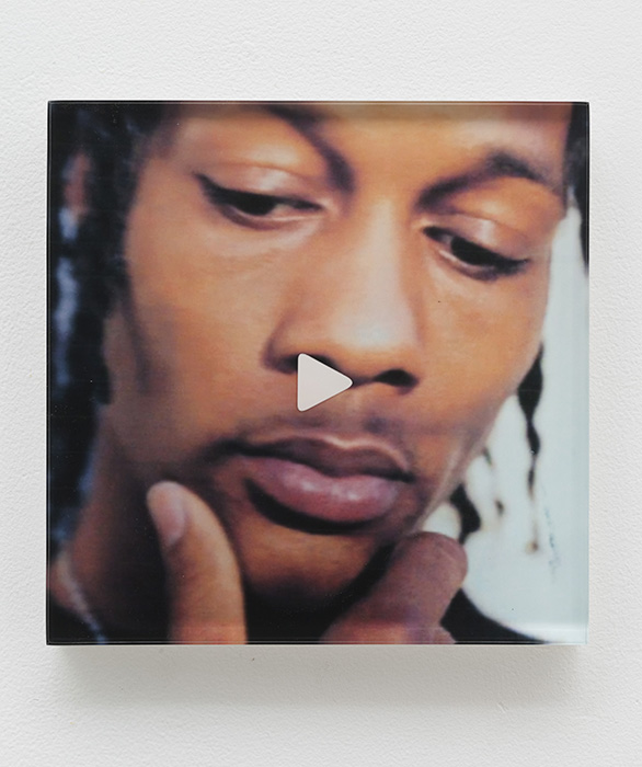 Where Bobby Jesus’s Alma Mater b/w Reading the Book of David and/or Paying Attention is Free was rhizomatic in its presentation of information, this exhibition is broadly linear. It demands to be read from left to right, around the room. It begins with a portrait of DJ Quik, a contemporary of Dr. Dre whose career, though influential, was less stellar, but whose music and stated commitment to “art for art’s sake” has featured prominently in Stark’s project to date. With a triangular button superimposed over his face, the artist directs us: Press play and listen. In the 2013 installation, one got the sense that she was working through this material alongside us. In this exhibition, however, we are being lectured.