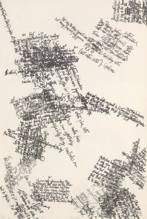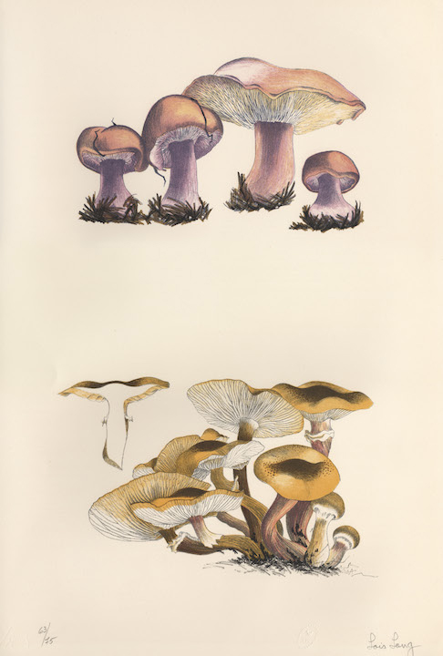 But Cage was genuinely an expert mycologist, as a book published this year by Atelier Éditions makes clear. John Cage: A Mycological Foray draws together articles, notes, and diary excerpts by Cage, which punctuate an historical essay by Atelier’s co-founder, Kingston Trinder. A Mycological Foray is published in a handsome slip case alongside a reprint of Cage’s 1972 Mushroom Book—a collaborative portfolio of lithographs on translucent paper, overlaying Lois Long’s illustrations of mushrooms with botanist Alexander H. Smith’s textual descriptions and Cage’s densely handwritten notes. The loose-leaved sheets can be matched up freely, allowing the reader, Cage writes in his introduction, to “hunt for a particular text in a given lithograph just as he might hunt for a mushroom, late summer or fall, in a forest.”