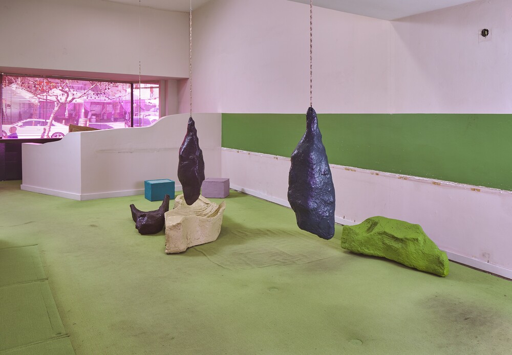 In the basement downstairs, three craggy white forms are tumbled with contrived carelessness onto the middle of the green carpet. I think these are meant to be giant molar teeth, but their roots also conjure the legs of side tables as if made in plaster by Franz West. If at this point in the exhibition I was ready to be shaken awake by a dramatic inflection point, these teeth did not quite deliver. Not nightmarish, not surreal, not funny or appalling or even particularly descriptive, they were unsatisfying. My gratification was frustrated—although maybe that was Nashat’s intention. If so, it seems like a low bar.