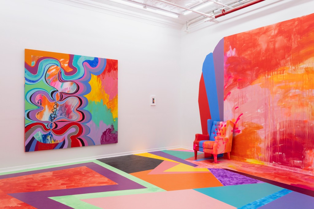 At the Tang, Cain painted the gallery’s entire floor, then added sofas, also painted, from which to view the works on the walls. Often, her exuberant marks spill off the edge of the canvas onto the wall or floor, collapsing the category of painting into installation. Other times, wall paintings (she avoids the term “mural”) incorporate canvases, sliced and deconstructed, along with other odds and ends. When she painted a wall beside the new Institute of Contemporary Art, Los Angeles, in 2017, she attached sequined backpacks she’d bought from a store down the street.