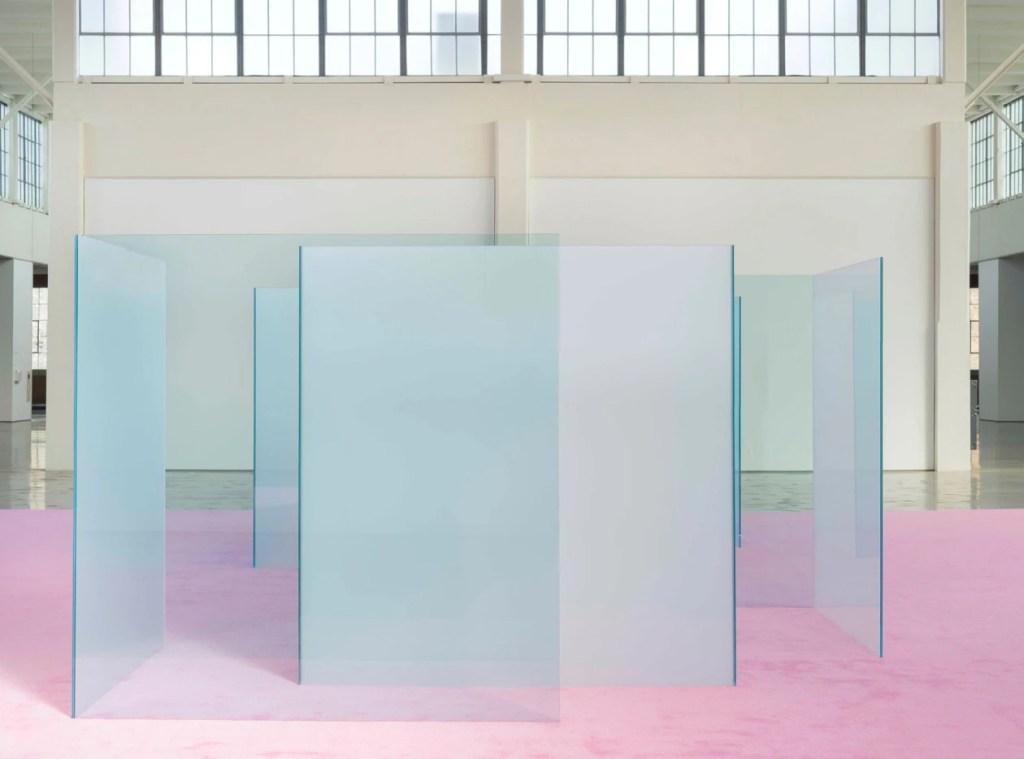 After Bell rigged up a cardboard version to demonstrate how the blue, green and frosted white glass panels would leak light if placed on the uneven concrete floor, they relented and asked him what colour carpet he had in mind. “At that moment, one of the curators walked by wearing this incredibly beautiful pink sweater. I said, ‘That’s the colour!’”