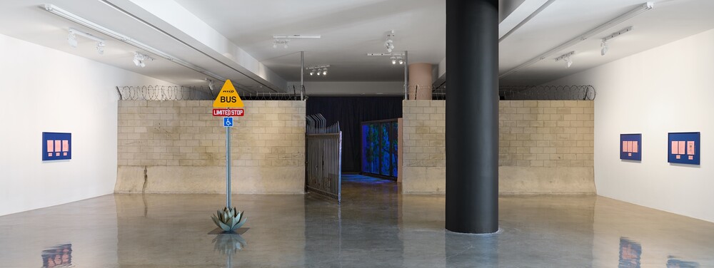 Fittingly, a high wall bisects the gallery, bristling with coiled razor wire. At its center, a battered metal gate stands ajar. Robledo Community Wall (Olamina cul-de-sac) (all works 2022) is a literal manifestation of the protective wall that surrounds the fictional settlement of Robledo in Parable of the Sower, and a literal symbol of exclusion and control, garnished with the threat of violence. Within “Shaper of God,” it steers the exhibition away from the archive and towards stagecraft; viewers are now cast as actors in a theatrical mise-en-scène. Artist invites us to rest on a bench beside a bus stop sign modeled after the vintage signage Butler would have waited at when she rode the bus (she did not drive). A second sign is placed on the other side of the wall; titled To Acorn (1984) and To Acorn (1968), respectively, the sculptures refer both to the new community established at the end of Parable of the Sower (in the year 2027), and to earlier, formative periods in Butler’s life before she began writing the book.