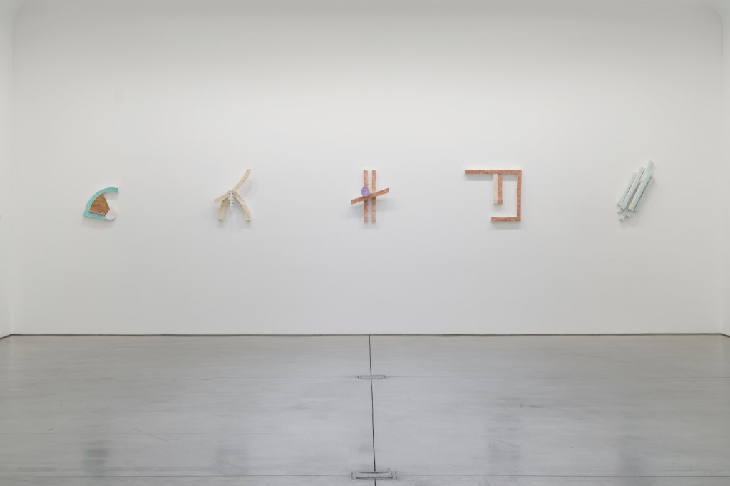 Tuttle’s pavilions at Pace are built from eight- by four-foot sheets of MDF, painted white and hinged to form polygonal bowers. They frame and shelter Calder’s sculptures in large, almost ungainly structures that seem at odds with the late modernist’s black-painted, organic outlines. Confluences slowly emerge, however. Both artists use the history and present of their work, the way it was assembled and the manner in which it is held together, to open up glimpses into its future – its stability and its potential for movement. I spoke to Tuttle, as we walked around these pavilions and, later, across La Brea Avenue in the galleries at Kordansky. We began by considering an untitled mobile – the only ceiling-hung work in the exhibition – in which three wire fish-like forms are suspended from horizontal rods.