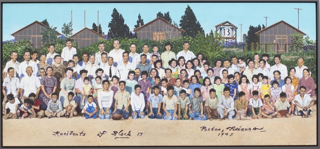 “Pop & me in front of our brand new grocery store,” reads the inscription on a small acrylic painting, part of Ben Sakoguchi’s multi-panel “Postcards from Camp” (1999-2001). In the picture, a man in a long white apron holds a toddler in front of a neat shopfront underneath the date of the scene, 1940, and the ominous words “Before camp . . . ”