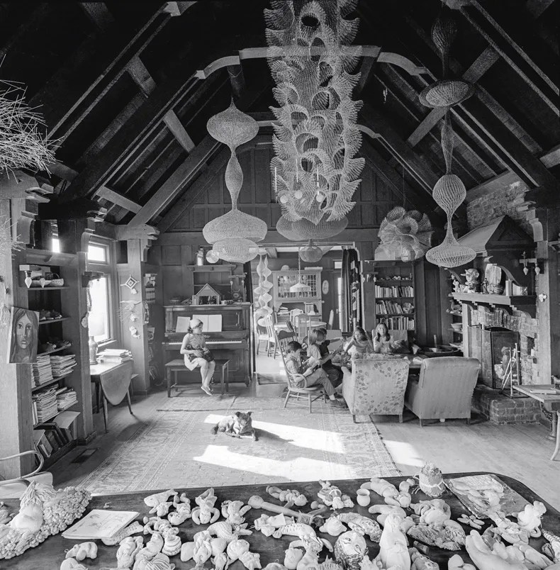 The black-and-white photograph shows a wood-panelled room with a pitched roof of dark redwood beams. A low table is pushed cosily up against a large brick hearth, and around it several children sit in easy chairs, one reading, others busily engaged in craft activities. At a piano, a girl strokes a cat, while a dog basks in the sunlight that slants across a large rug. This peaceful scene is the San Francisco living room of the artist Ruth Asawa (1926–2013), photographed in 1969. Asawa is nowhere to be seen, but her art is everywhere. Most conspicuous are the hanging wire sculptures for which Asawa is best known. Resembling elaborate lanterns or lighting fixtures, or biomorphic models of seed-pods or chrysalises, or complex fishing nets, or baskets, these sculptures fill the darkened space beneath the high rafters with miasmic, playful movement, catching the light as it filters through the window.
